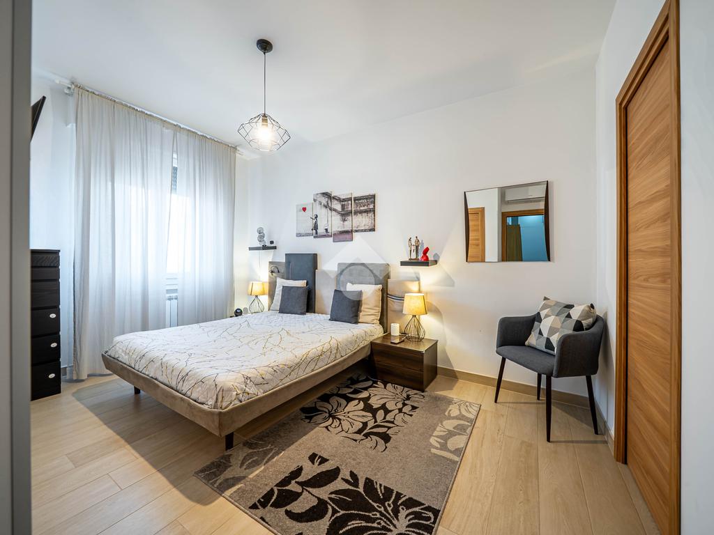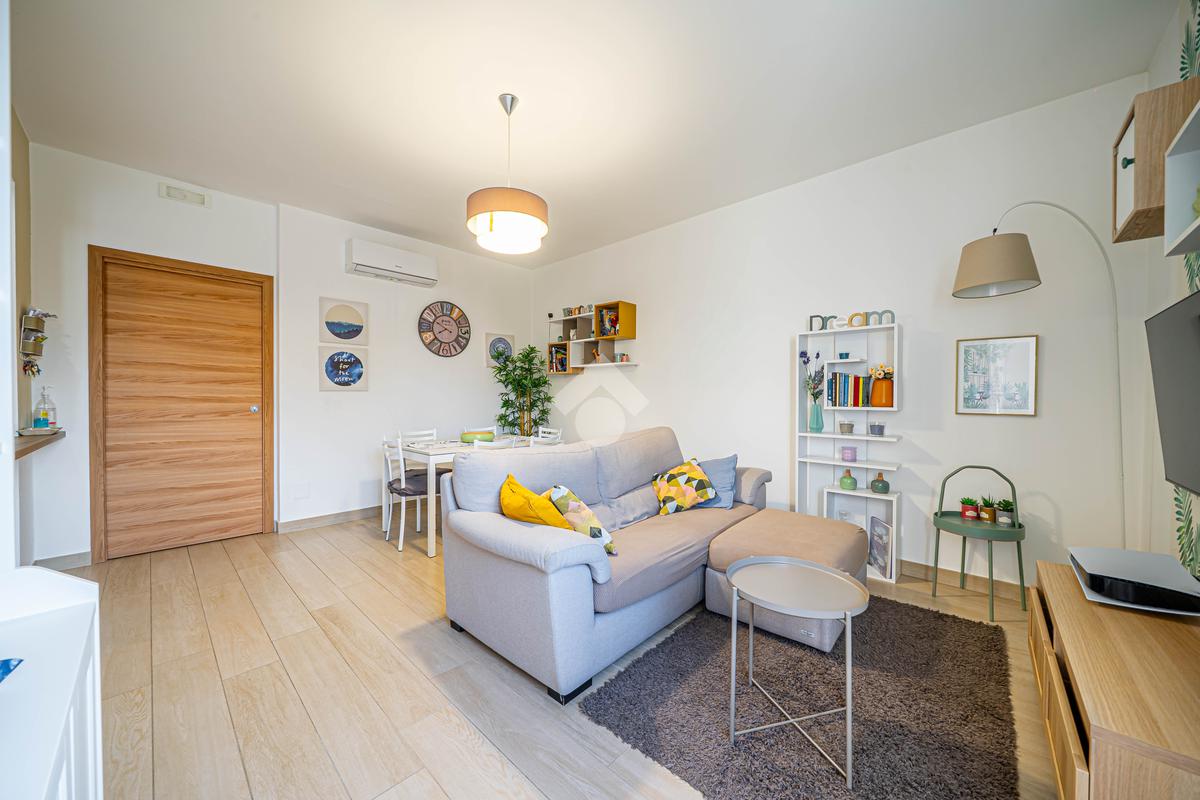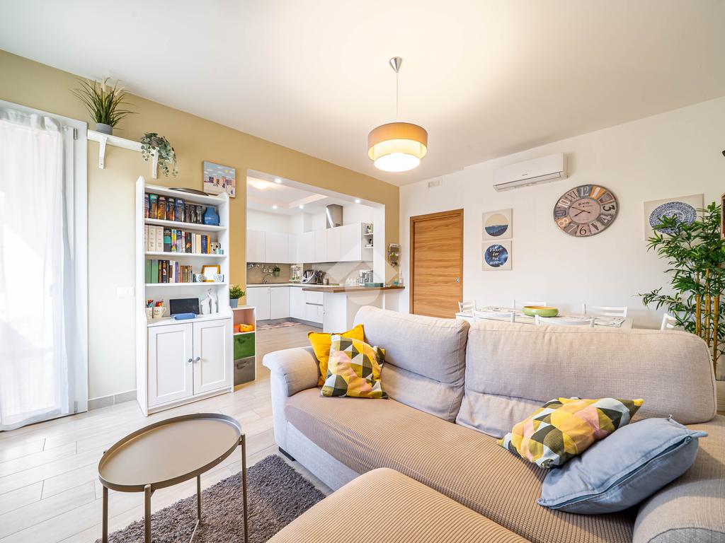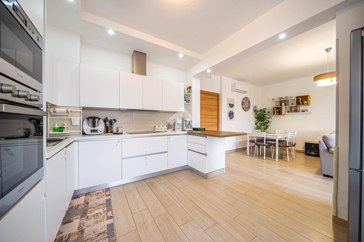 L'immobile si trova al 2° piano, è dotato di un'ottima esposizione sui lati sud/est/ovest ed è servito dall'ascensore. Ingresso, soggiorno, cucina open-space con balcone, disimpegno notte, camera matrimoniale con bagno e cabina armadi, camera singola, ulteriore bagno, piccolo ripostiglio nell'ingresso. Garage singolo di proprietà.