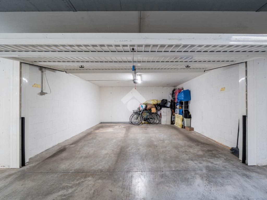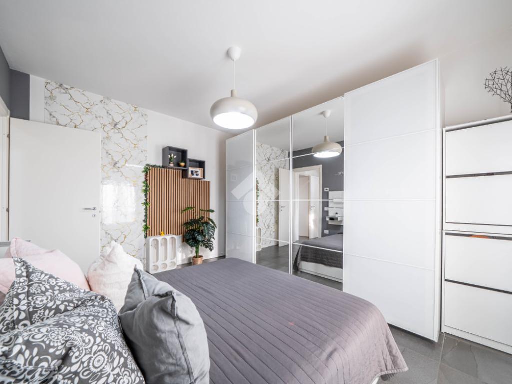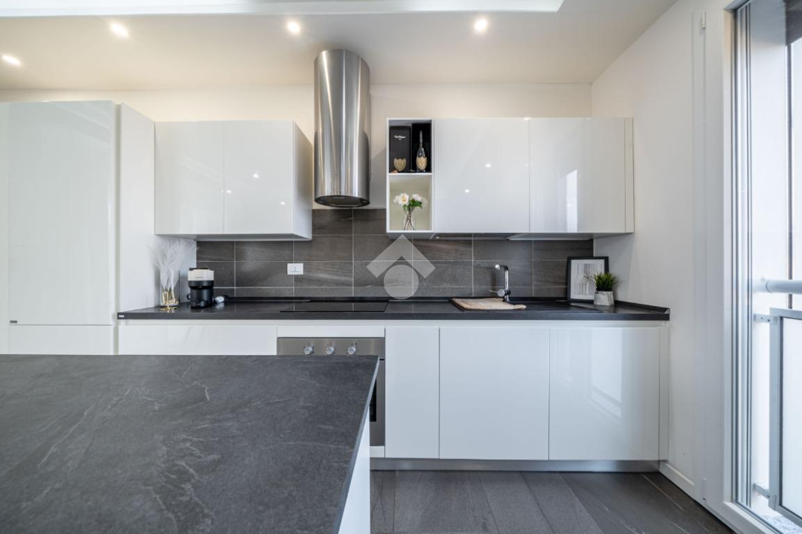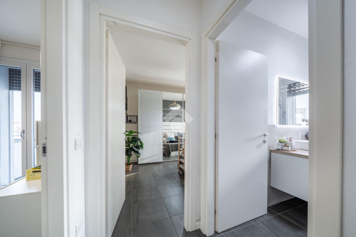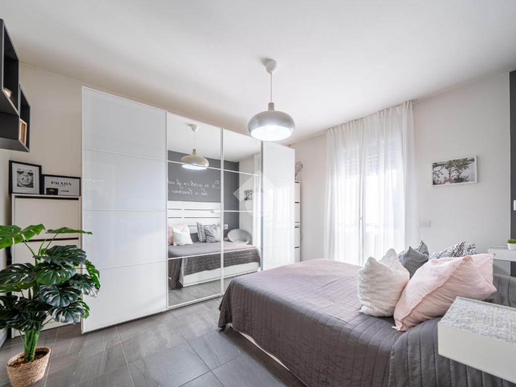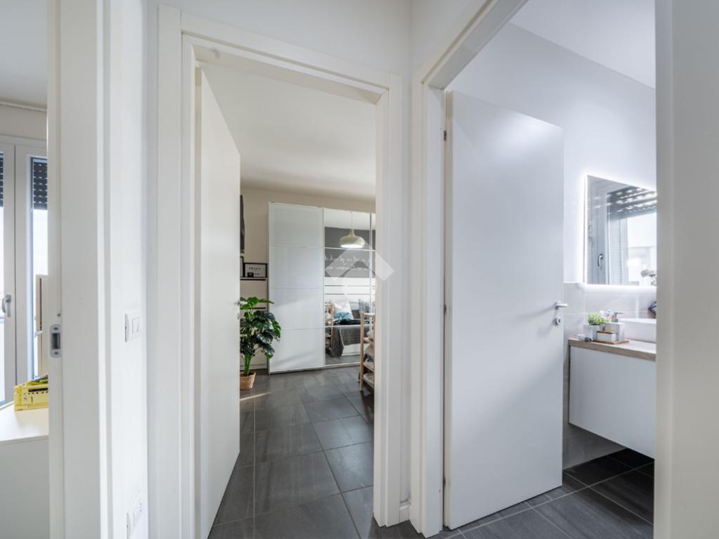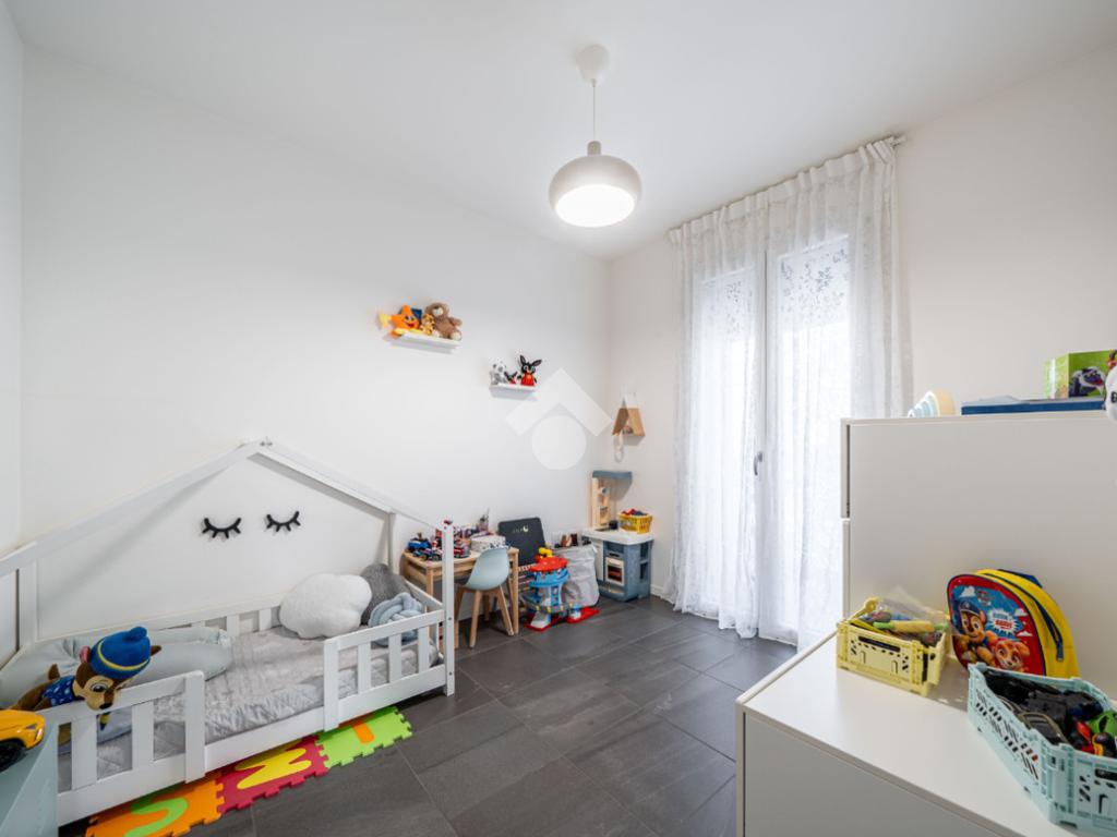 L'appartamento è situato al 2° piano con ascensore ed è così composto: soggiorno con cartongesso e sistema di illuminazione integrata, cucina a vista e terrazzino, disimpegno notte, camera matrimoniale, camera singola con balcone e bagno. Completa la soluzione il garage doppio nell'interrato.