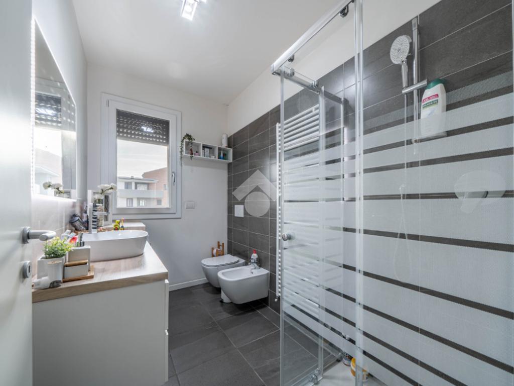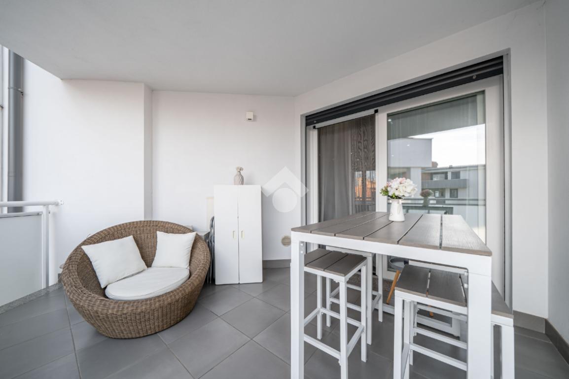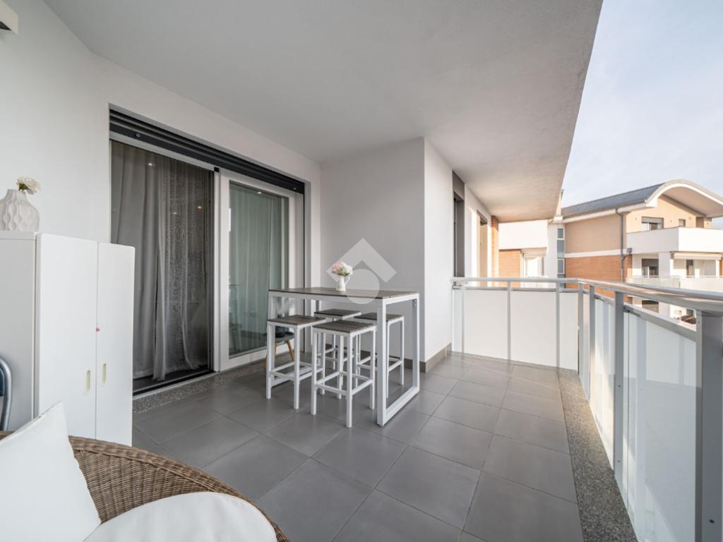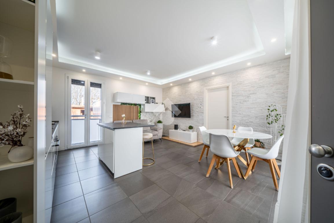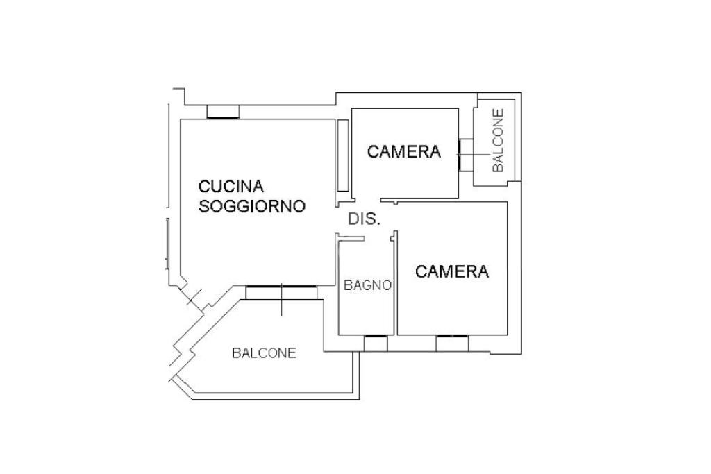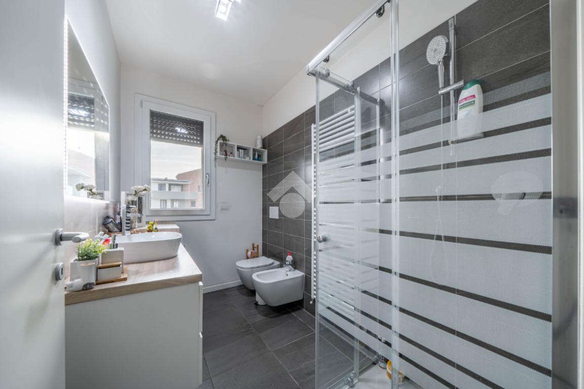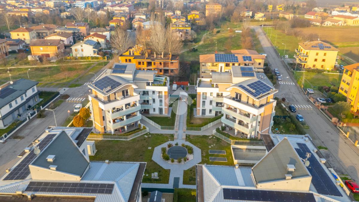 L'appartamento è situato al 2° piano con ascensore ed è così composto: soggiorno con cartongesso e sistema di illuminazione integrata, cucina a vista e terrazzino, disimpegno notte, camera matrimoniale, camera singola con balcone e bagno. Completa la soluzione il garage doppio nell'interrato.